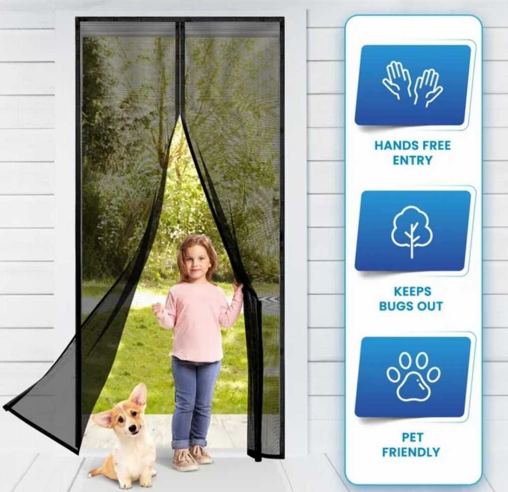 Magic Mesh Hands-Free Screen Door opens easily then closes itself behind you using 18 powerful magnets. So, if your hands are full or you have a forgetful family member, you can still let fresh air in and keep annoying bugs out!It goes up in seconds with no tools required and stays up all season long. Plus, it folds for easy Storage. Great for Pets too.
